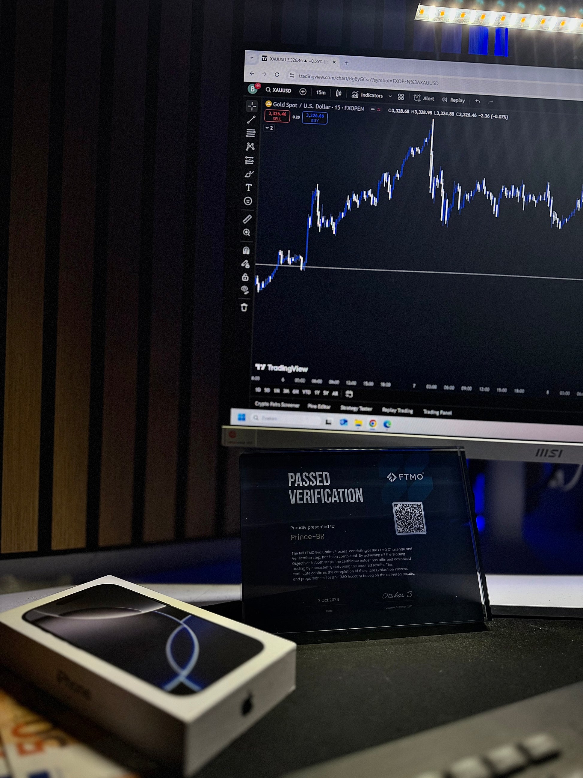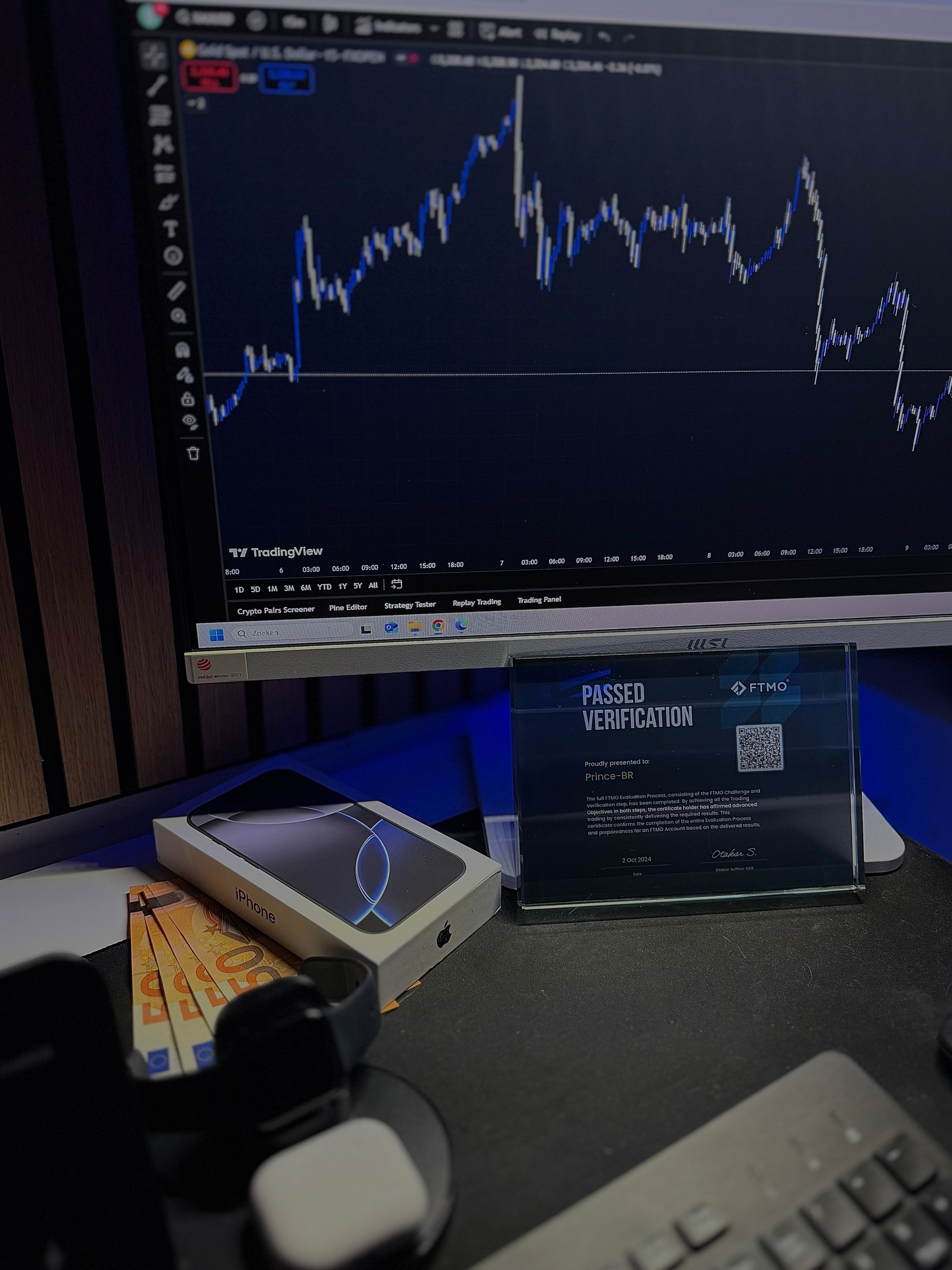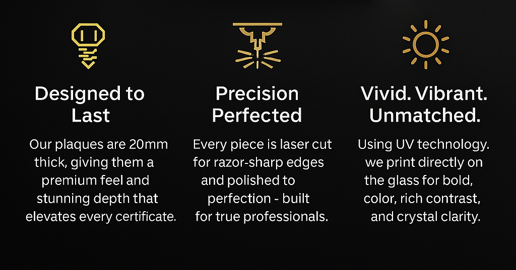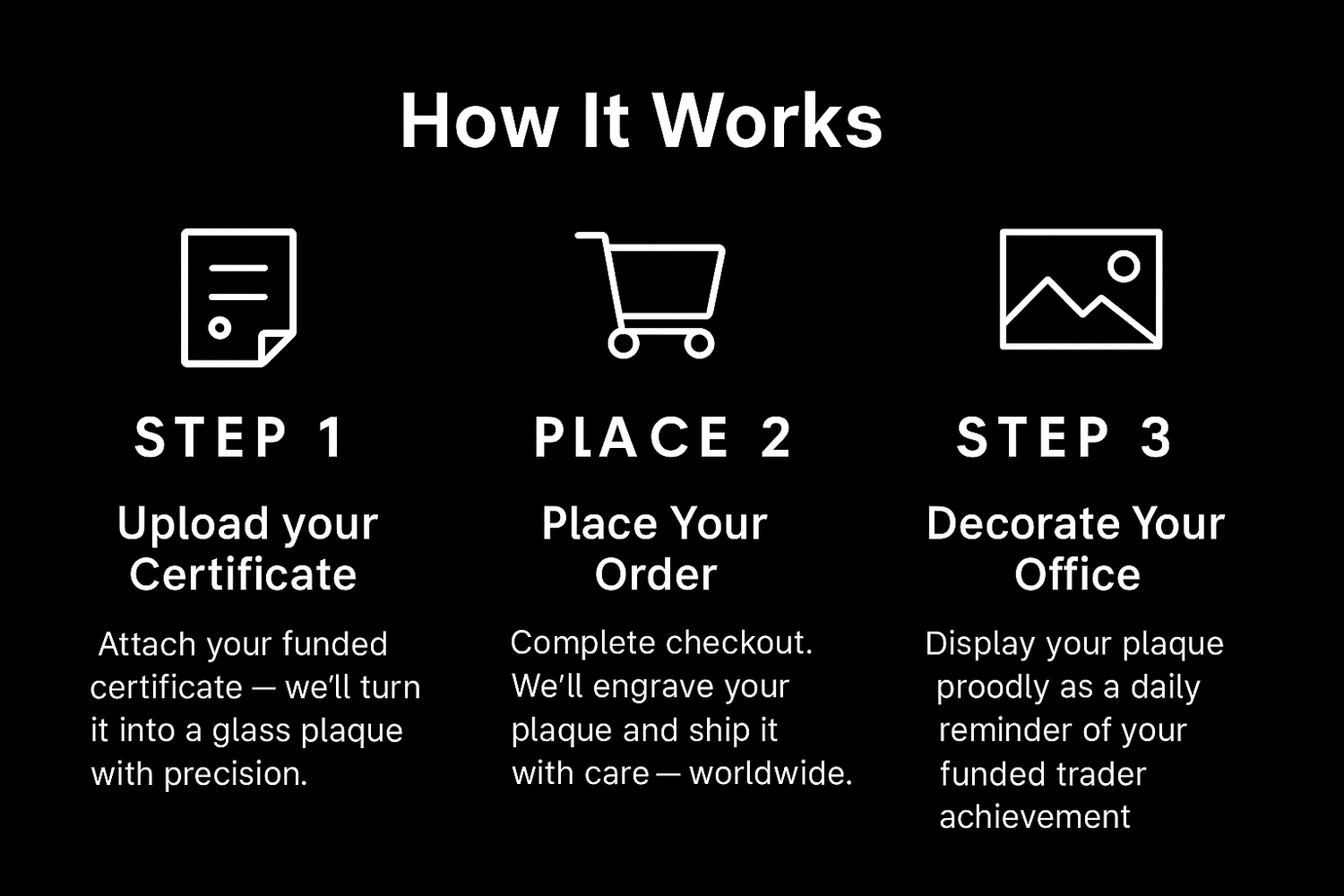 Celebrate your funded trader success with a premium 13x18cm 3D glass plaque, UV-printed with your unique certificate.